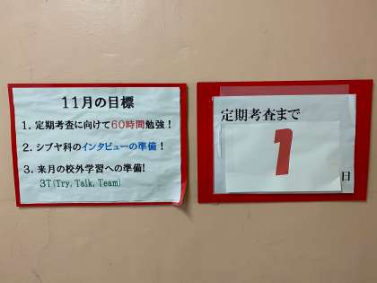 いよいよ1・2年生は定期考査が明日に迫っています。1年生廊下のカウントダウン表も「定期考査まで1日」になりました。