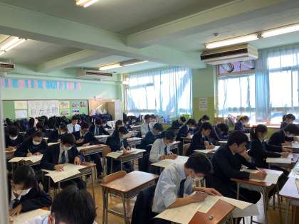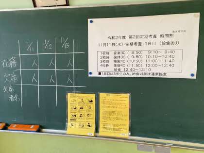 また、3年生は本日から定期考査が始まっています。問題集片手に登校するなど真剣な様子で取り組んでいます。写真中段は定期考査時の在籍確認の黒板です。懐かしい保護者の方も多いのではないでしょうか。 校長
