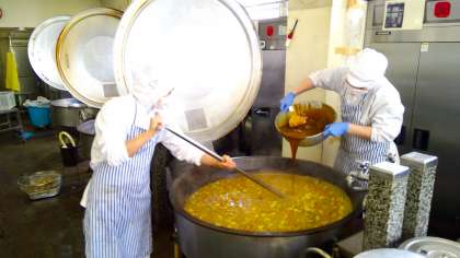 給食では、バター、サラダ油、小麦粉、カレー粉で手作りしたカレールーを使用しています。