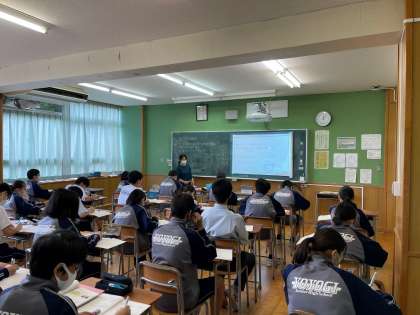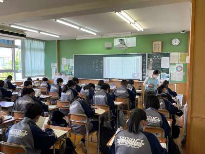 いよいよ明日の午後にオンライン授業を実施します。写真は日常の授業風景に見えますが、明日のオンライン授業の練習も兼ねて欠席者に授業を配信しています。先生方は、連日タブレットを教室に持ち込み、「どの角度でタブレットを置けば見やすいか」、「画面共有した方がきれいだけどタイムラグが気になる」などアイデアを出し合いながらテストを繰り返しています。明日は一人一台端末を活かした授業を成功させましょう。
