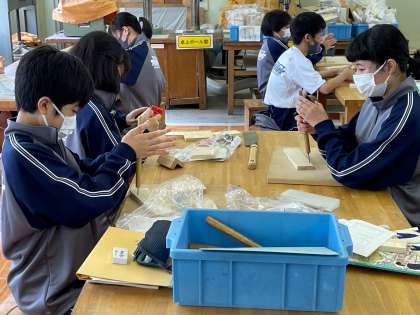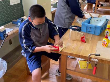 本日1時間目の1年4組技術(ペン立て作製)の様子です。ヤスリ掛けしたり、キリで穴を開けたりと、夢中になって作業に取り組んでいました。 校長