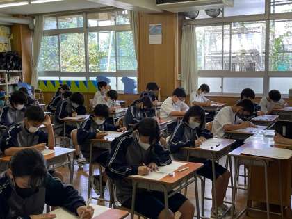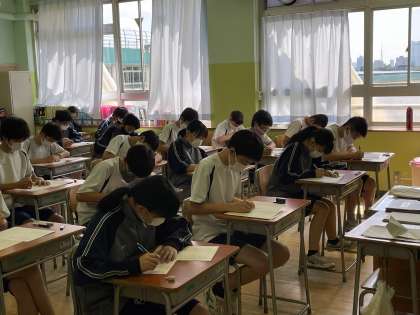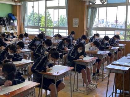 本日定期考査2日目です。どの学年・学級も集中して取り組んでいます。写真は上から、3年3組、2年3組、1年3組の様子です。学習の成果が発揮できるように最後まで全力でがんばってください。 校長