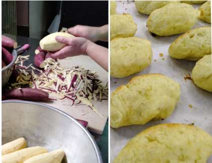 スイートポテトは、さつまいもの皮ををむいて、蒸してつぶすところから手作りです。
