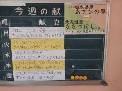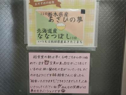 ふだんの給食のお米は、「あきたこまち」ですが、12日(木)は栃木県産の「あさひの夢」、13日(金)は北海道産の「ななつぼし」だそうです。果たして違いが分かるか楽しみです。