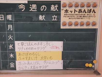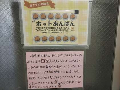 明日の献立についての紹介が掲示されていました。「ホットあんぱん」とは、明日の給食が楽しみですね。