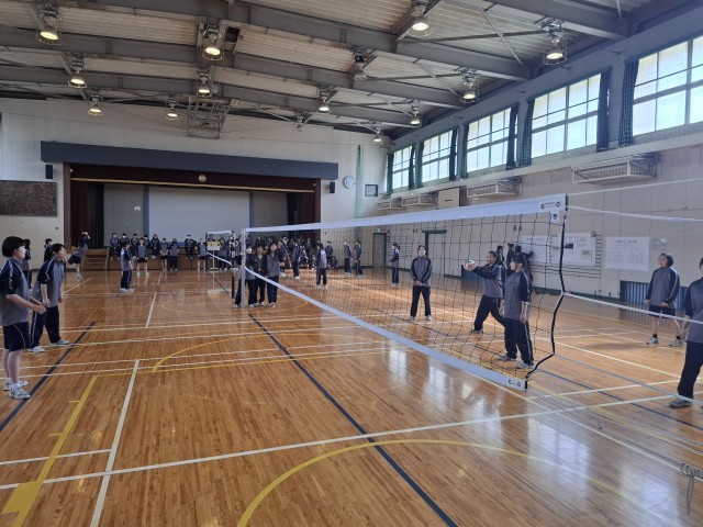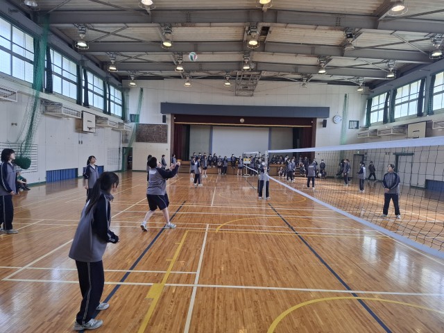 本日の5時間目と6時間目は、校庭と大体育館を使って球技大会を実施しています。校庭は男子がサッカー、大体育館は女子がバレーボールを行っていました。後半は大体育館でドッジボールを行います。