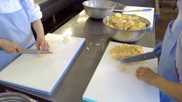 たけのこ10kgを使った大量調理ではありますが、多くの野菜のカットは家庭と同じように包丁で手切りです。