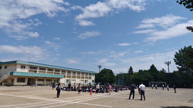 今回は地震想定。発災後避難経路を確認して、校庭に一時避難しました。