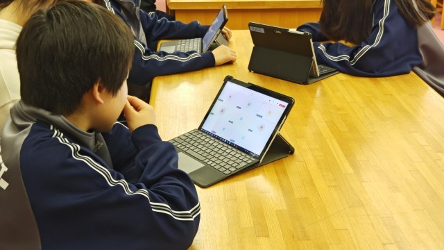 本日は生徒朝礼、図書室から配信型の朝礼です。写真は図書室から生徒会本部役員が配信している様子です。教室で大型モニターにて受信しています。