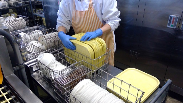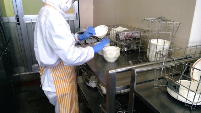 全クラス分の食器を手に取って見ながら、割れていないか確認しています。