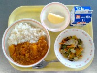 牛乳チキンカレーライス寒天入りひじきサラダりんご