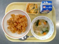 牛乳メキシカンピラフチーズオムレツ豆とマカロニのスープ