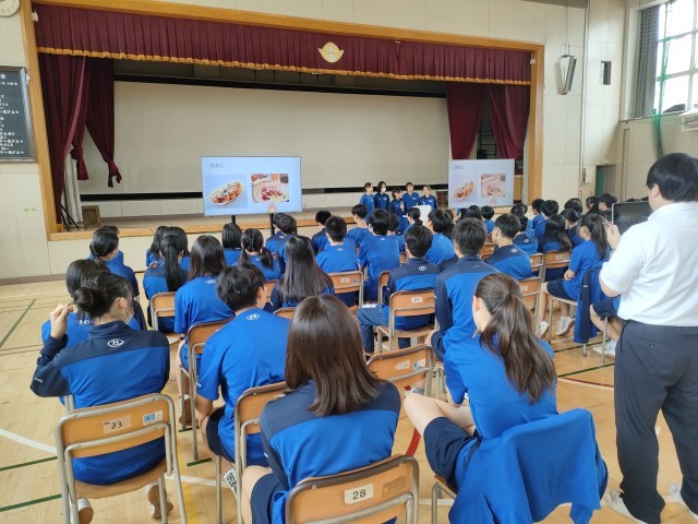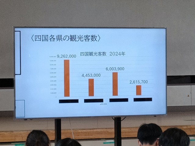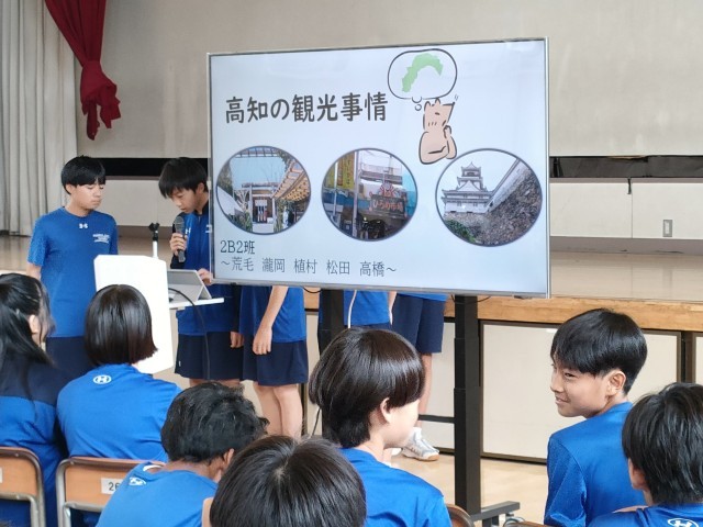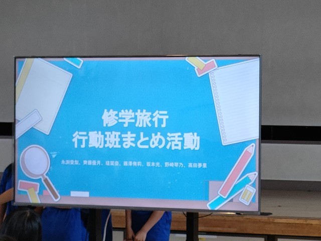 今日の1校時目 体育館で3年生たちが修学旅行のまとめの発表会をしていました。