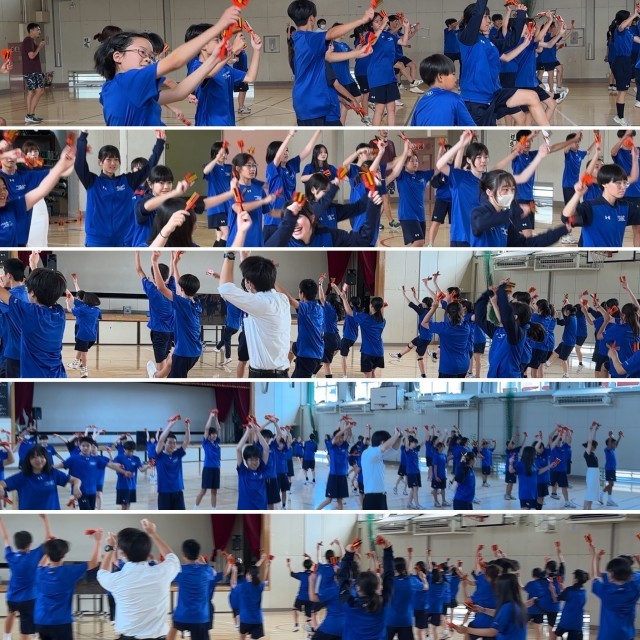 阿部先生のマイクパフォーマンス(あおり)の掛け声を聞きつけ、プール授業前の3年生が裸足で途中参加。汗だくで踊りまくっていました。今頃プール、気持ちいいでしょうね。