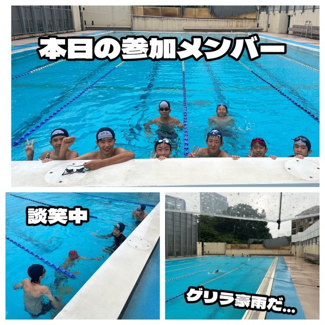 今日のスポ活は、プール開放日。しかし開始直前にゲリラ豪雨…。雨が降ると誰が辛いって、監視している私が1番辛いわけで…。どんなに雨が降っていても、本校では、雷さえならなければ、気温も水温も規定は超えていれば、入水します。「今日は早く上がるか?」と、たずねると「もちろん時間いっぱい入りま〜す♪」と元気いっぱいに答える生徒たち…。傘をさしながら、監視していました…。