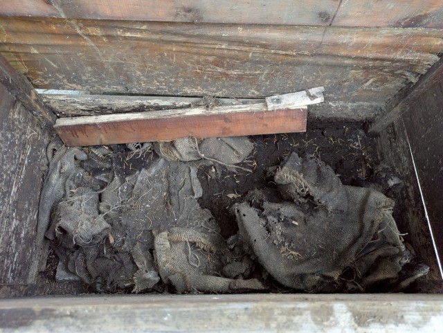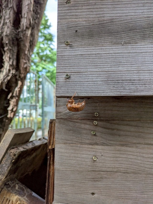 麻袋がまだ残っているのでハサミで細かく刻んでいましたが、よく見ると木製のコンポストに蝉の抜け殻が!