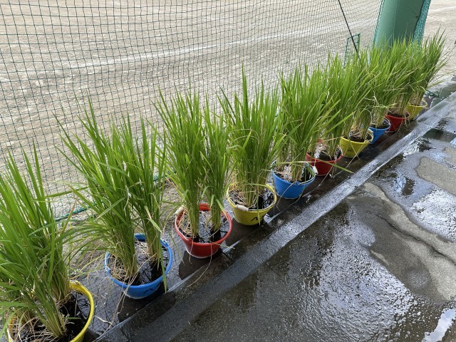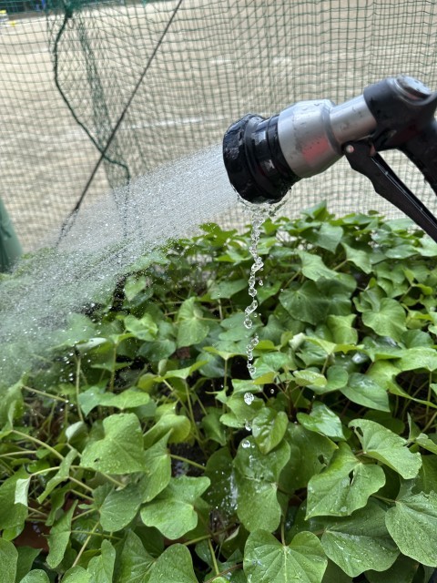 午前中は日差しも和らいでいたので、校庭の作物に水遣りをしました。
