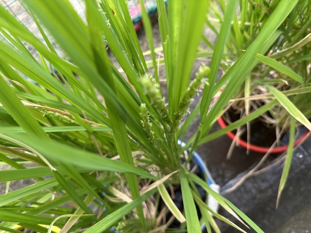 トマトとサツマイモにたっぷりと水を与え、ふとバケツ稲をみたところ、立派な穂がでて花が咲いていました。