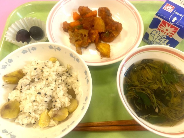 今日の給食では、1日早い重陽の節句をお祝いし、秋に旬を迎える食材をたっぷり使った献立を提供しました。