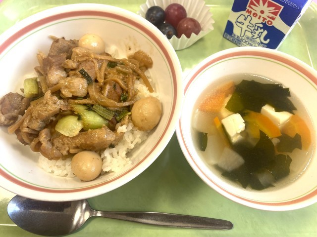 今日の給食は、台湾の定番料理「ルーローハン」と「ルオボータン(大根スープ)」でした。
