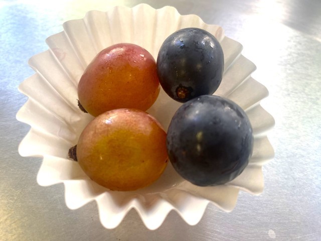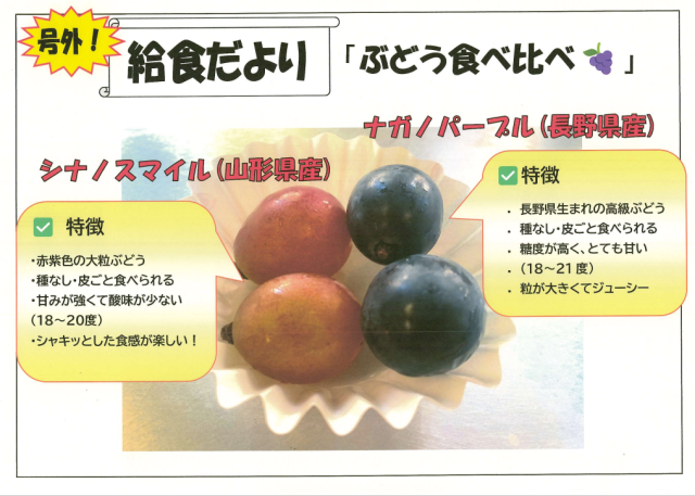 デザートは、ぶどうの食べ比べをしました。皮の色や食感が違いますが、どちらも糖度が高く美味しいぶどうでした。