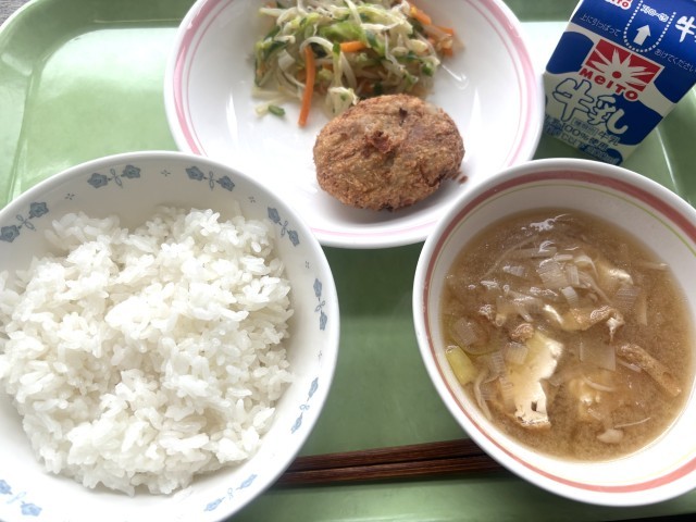 給食室では、生の里芋を茹でてつぶし、炒めた肉と玉葱を混ぜてコロッケにし、揚げました。
