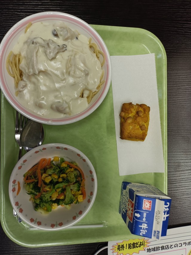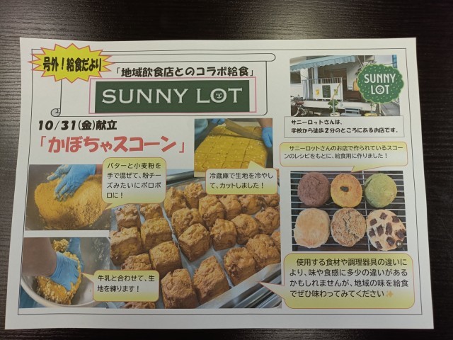 今日の給食は ハロウィンということで、スペシャルメニュー サニーロットさんのスコーンを提供!!