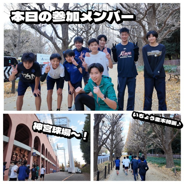 今日は、久しぶりのRUN CLUBで、神宮球場&いちょう並木に行ってきました。普段は帰りは、国立競技場をぐるっとまわって学校に帰ってくるので、5kmに到達するのですが、私は、怪我でまだ走れないので自転車にて伴走しました。国立競技場は自転車で走っていると注意されるという生徒情報を聞いたので、国立競技場周りは走れない…。と、言うことで神宮球場を2周して、それでも足りなそうって事で、少し背伸びして青山一丁目駅まで走って、さらに戻りがけに神宮球場を半周して…と、なかなか5kmに到達せず変なコースになってしまいました…。でも、みんなとくだらない話をしながら、楽しく走りました。最初こそ寒いですが、走っていると体が温まってきてとても心地よさそうでした。ある生徒は、途中からランニングにニット帽という違和感しかない服装で走っていましたが、それも後ろから見ていると笑いのネタになりました。