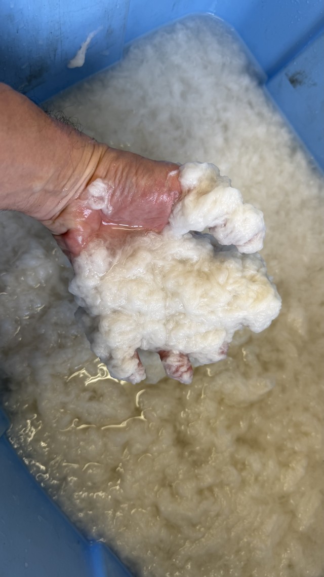 ③繊維がバラバラになった紙をザルで濾し、不純物を取り除き、原材料の状態にする
