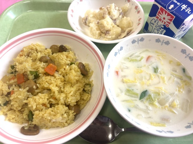 今日は、他校で大人気のメニュー「カルボナーラポテト」を、栄養士さんに教えていただき、本校でも実施しました。