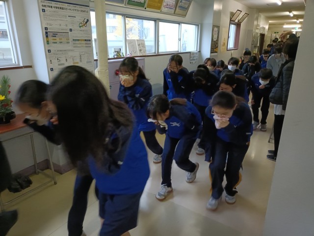 今日の避難訓練は、原宿消防署の協力で 晴天ならば 避難体験を代表生徒がする予定でしたが、
