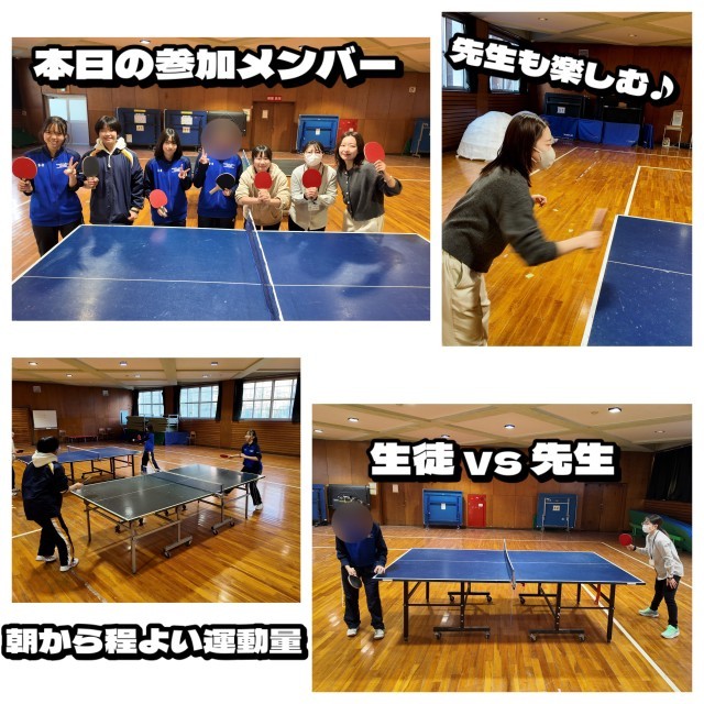 今日は久々のレディースDAYでした。前日全く告知をしなかったので、誰も来ないかもなぁ…と、不安な気持ちでいると、体育館下へ降りてくる足音と話し声が聞こえてきて、5名の女子生徒が参加してくれました!そして、今日は2名の先生も参加してくださり、私も含めて8名で楽しむことができました!ダブルスを組んで、先生チームに挑戦したり、シングルで挑んでみたりと白熱した試合が繰り広げられました。今月は、あと1回レディースDAYがやってきます。保護者のみなさん、ぜひお子様に声掛けをお願いします!