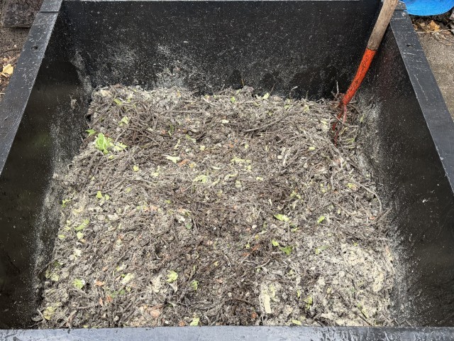 分解が進むように適量の水分を足しましたので、しばらくすると温度が上昇してくると思います。