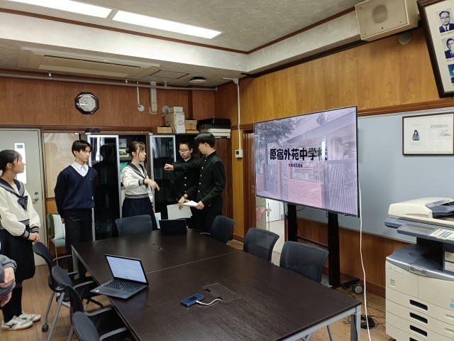 写真は、校長室で 学校紹介のプレゼンの最終リハを行っている様子です