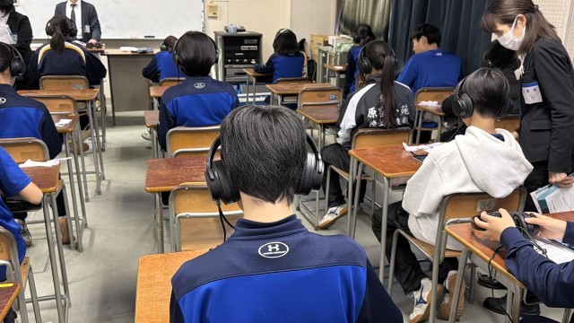 動画を視聴、それに対する回答を口頭で行います。よって静かな環境が必要だということで、1年生は視聴覚室にて実施となりました。