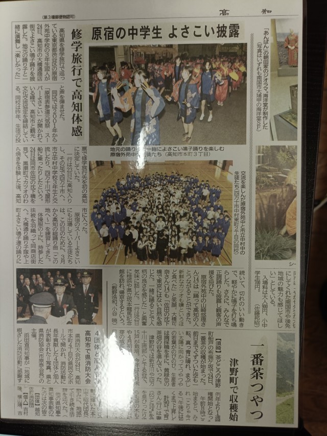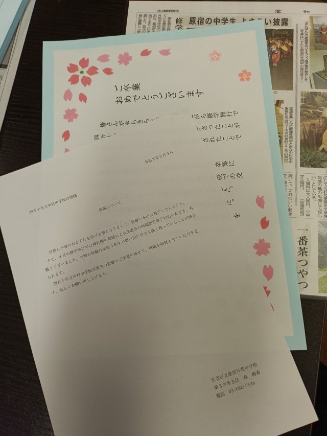 修学旅行でお世話になった四万十市立中村中学校の3年生も間もなく卒業を迎えます。