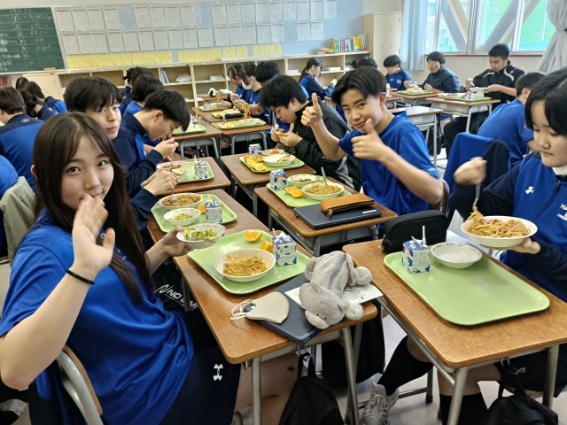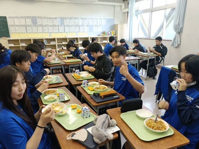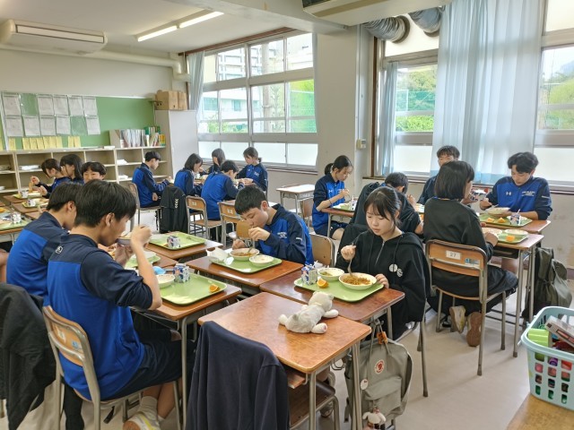 やはり 給食の時間はにぎやかですね!  3年生はもう慣れたもの!!