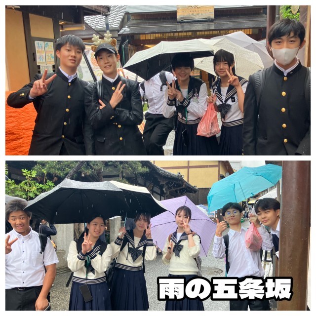 雨の五条坂も風情があっていいですね。足元は悪いけど、これも思い出のひとつに残ることでしょう。頑張れみんな!