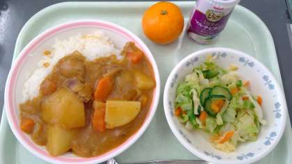 今まではコロナで衛生面を考慮し、食後のおかわりは出来ませんでしたが、今月からお替り自由となり、カレーはおかわりでほぼ完食状態でした。みかんは愛媛産のみかんで、甘くておいしかったです。