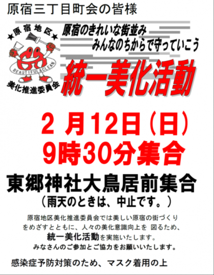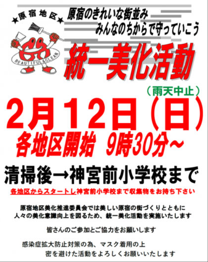 原宿地区美化推進委員会「統一美化活動」2月12日(日)9時30分