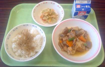 9月13日(水)献立 公開日 2023/09/13 更新日 2023/09/13 今日の給食 ・牛乳 ・ごはん ・じゃこふりかけ ・筑前煮 ・カリカリ油揚げのお浸し 筑前煮は、野菜と鶏肉を炒めて、 砂糖、醤油で甘辛く作る煮物です。 昔、福岡県筑前地方(現在は福岡県北部)で 作られていた煮物のため、「筑前煮」という 名前がつきました。 いいね(0)