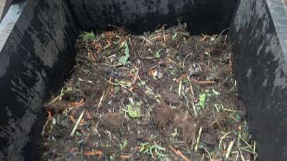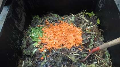 先日、大量の向日葵を投入しましたが・・・すごい勢いで分解が進んでいます。順調に白カビも発生。コンポストの中の温度も46度。手を入れるとお風呂のようです。