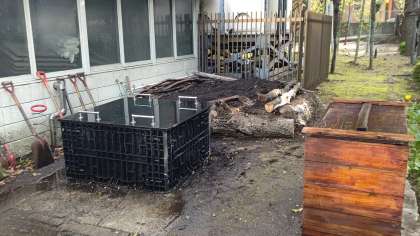 引き渡し訓練の直後に、地域コンポスト活動「土づくりプロジェクト」作業を実施しました。給食の野菜クズ(キャベツ・キュウリ)と参加者持参のコーヒーかす、卵の殻などを投入。耕運機で切り返し(混ぜ込み)をしました。