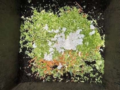 さて本日は野菜くずの入ったポリバケツがいっぱいでしたのでキャベツ、ニンジン、タマネギ、江戸菜、ネギなど全て刻み混ぜ込みました。卵の殻も約2キロ投入です。