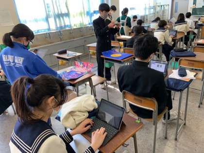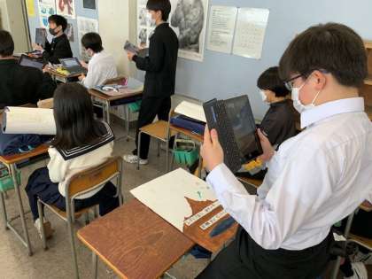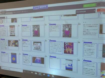 2年B組「美術」。各自の作品の写真を共有アプリに張り付け、作品についての振り返りを入力します。写真とコメントを全体で鑑賞できるようにしました。