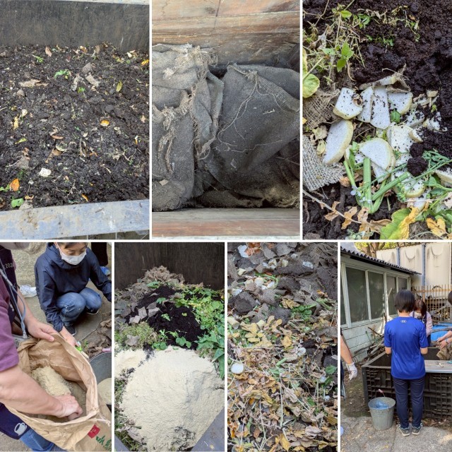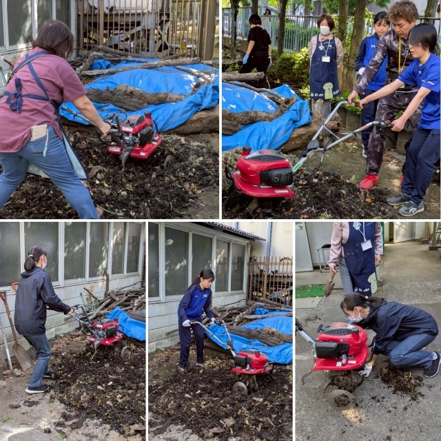 入れたものは①麻袋を裁断したもの②人参の皮③柑橘系の皮④育ちのよくなかった大根⑤米糠⑥珈琲カス⑦水⑧シュレッダーくずなどなど。最後は耕運機を使用して攪拌しました。耕運機はみなさん何度も触れているので、取り回しが上手くなってきたと感じます。今後の分解が楽しみです。