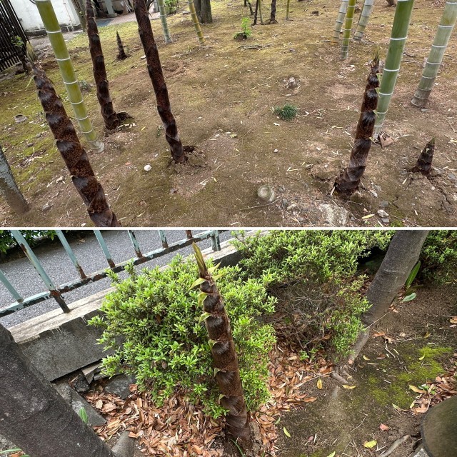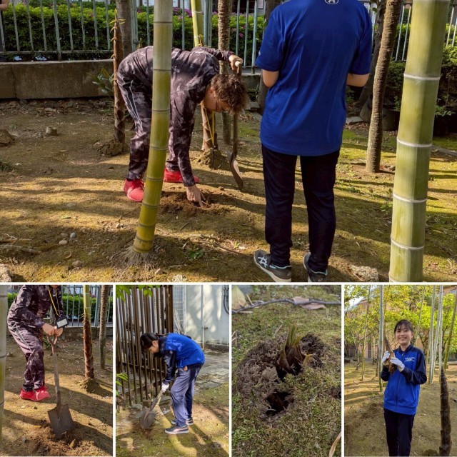 あと切り返し作業と同時に楽乃苑(竹林)のタケノコを間引きました。参加生徒に持って帰ってもらいました。