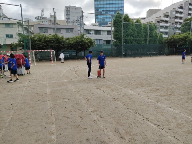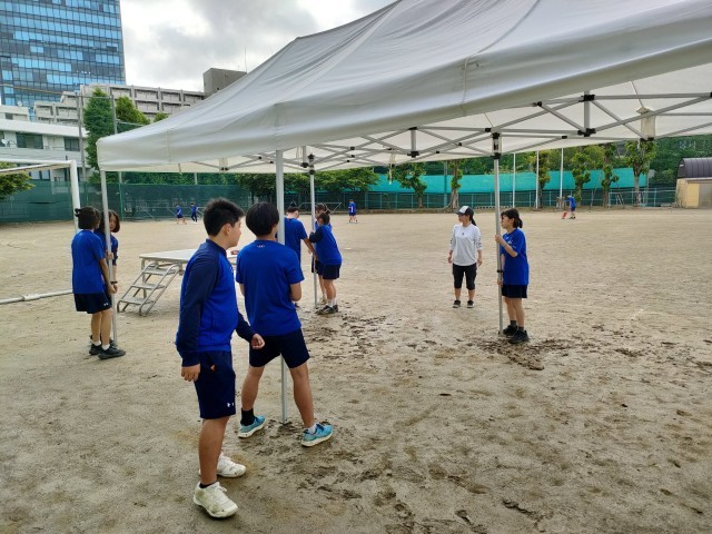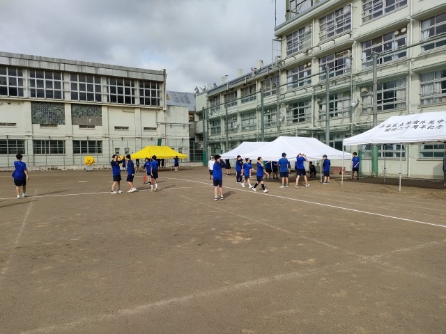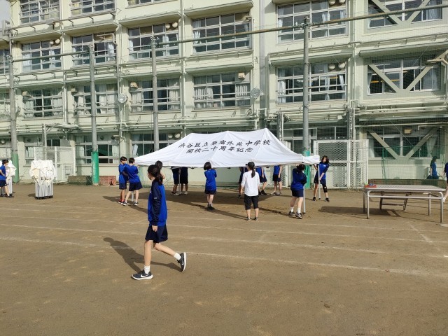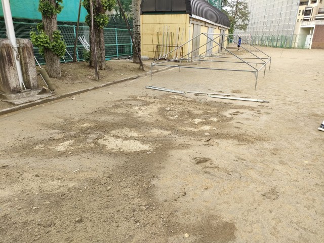 校庭にテントが立ち 白いラインが引かれ グラウンドが整備され