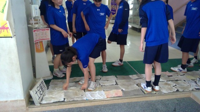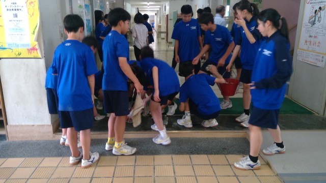 最後は美化委員が雑巾を準備して、みんなに上履きについた砂を拭いてもらいます。