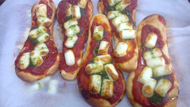 マルゲリータ風は、ナンと手作りのピザソース、モッツァレラチーズ、バジルソースを使って作りました。